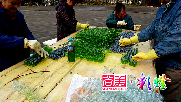 這里的小藥瓶主要是青霉素玻璃瓶,制作工藝一般是通過(guò)灌入相應(yīng)顏色的顏料水捆扎,然后通過(guò)內(nèi)光照射,形成通透的圖案而成的彩燈。