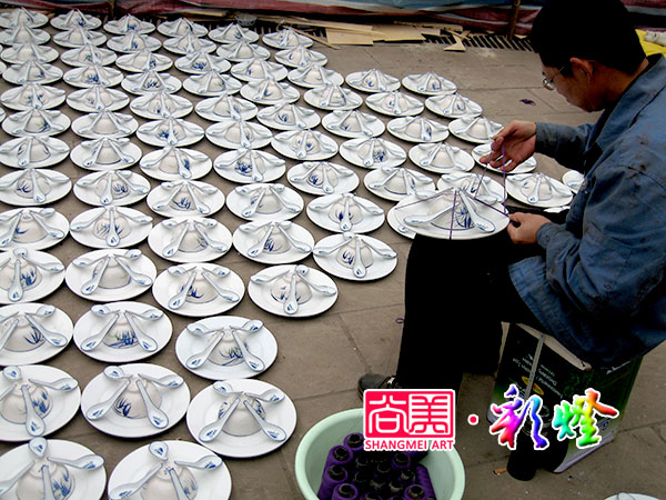 瓷器燈是自貢彩燈的又一大特色彩燈,它采用的就是日常所見(jiàn)的瓷杯、瓷盤(pán)、磁碟、瓷勺作為制作主材料,運(yùn)用獨(dú)特的捆扎技術(shù)將瓷器材料捆扎在立體造型的燈組上。這種燈組本身不內(nèi)透光,必須通過(guò)外光展現(xiàn)其特有的藝術(shù)氣質(zhì)。