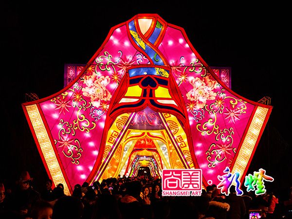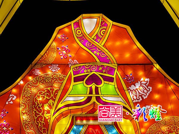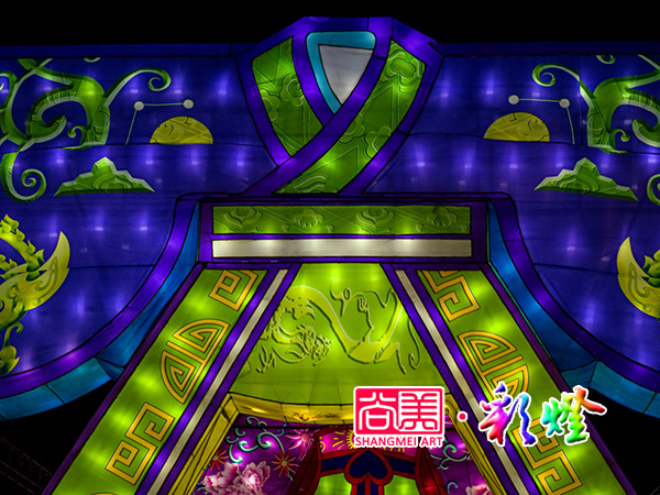 西區(qū)中軸線一組名為“絲路霓裳”的彩燈,可謂今年大廟會上最“打眼”的一組彩燈。十五組漢服彩燈翩翩展開,龍鳳、祥云、花鳥、藤蔓等傳統(tǒng)刺繡紋飾點綴其間。