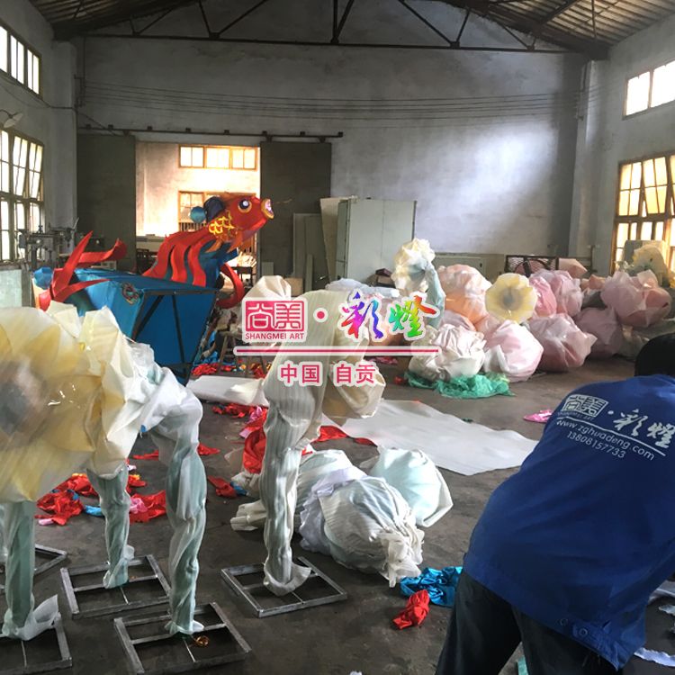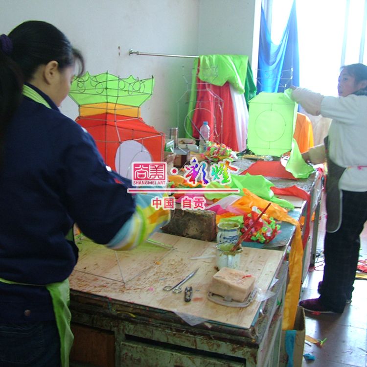 【產(chǎn)品工藝】絲架(鐵絲焊接)造型,綢布分色裱糊,收工繪畫,部分圖案剪紙粘貼,折疊組合式,內(nèi)部安裝一只帶防水燈頭的40瓦白紙燈泡或者一個(gè)帶防水燈頭的5瓦的led燈即可;