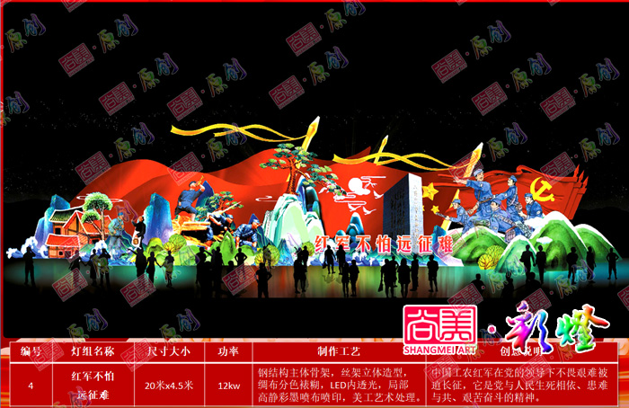 紅軍不怕遠(yuǎn)征難彩燈:中國工農(nóng)紅軍在黨的領(lǐng)導(dǎo)下不畏艱難被迫長征,它是黨與人民生死相依、患難與共、艱苦奮斗的精神。