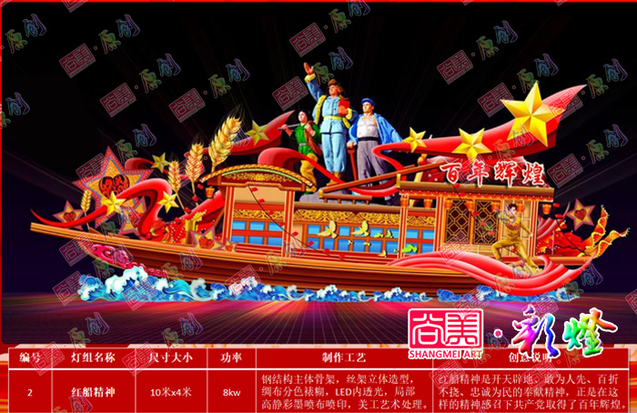 紅船精神彩燈:紅船精神是開天辟地、敢為人先、百折不撓、忠誠為民的奉獻(xiàn)精神,正是在這樣的精神感召下共產(chǎn)黨取得了百年輝煌。